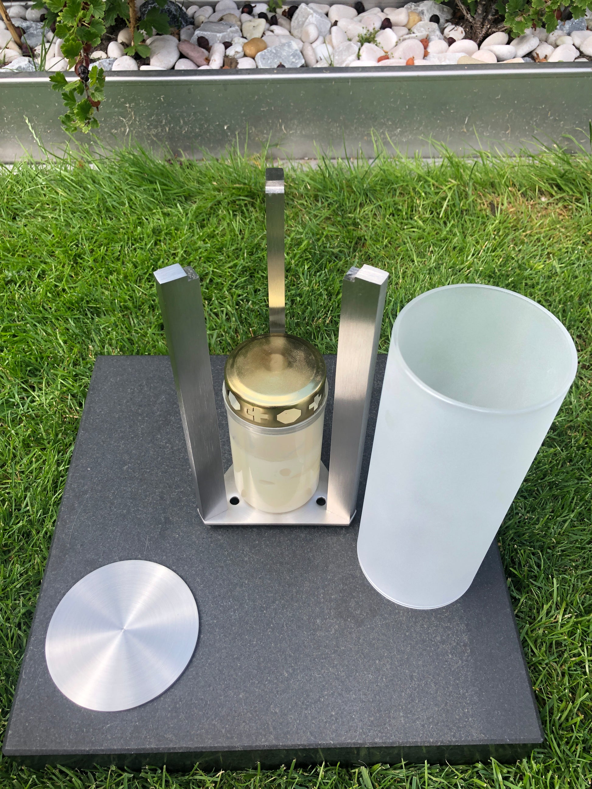 Die Laternen aus unserer Produktion sind für handelsübliche Grablichter ausgelegt, dieses Modell für einen 7-Tagesbrenner. Durch eine Belüftung brennt die Flamme zuverlässig und windsicher.