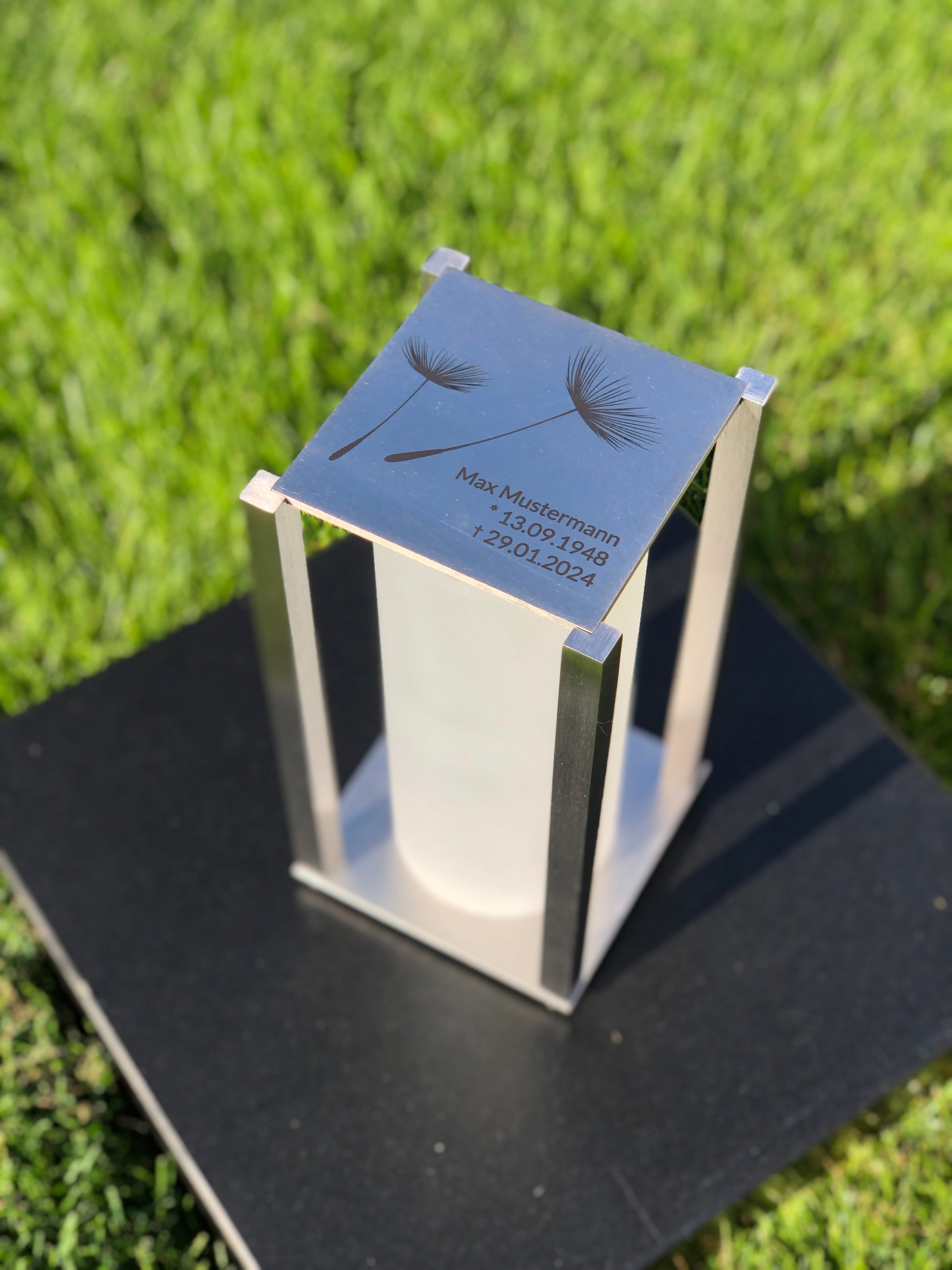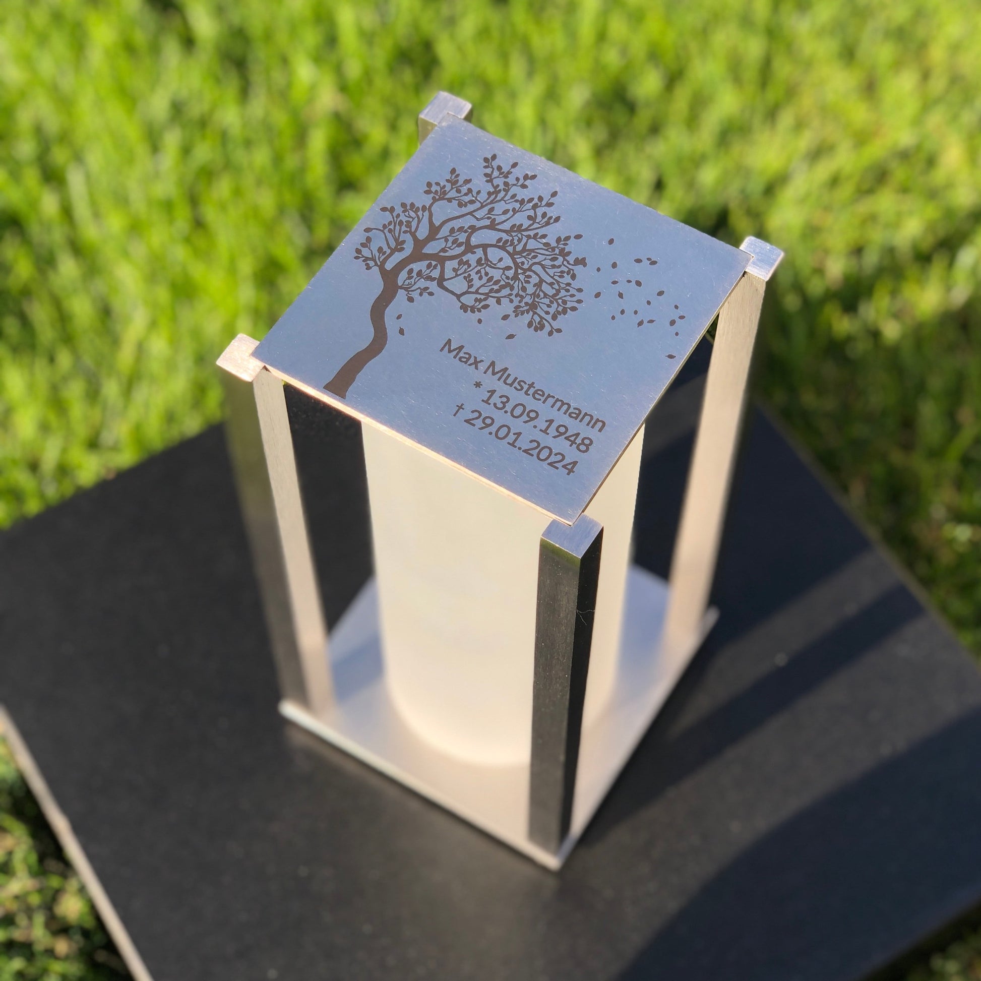 Hochwertige Grablaterne aus Edelstahl für eine moderne Grabgestaltung