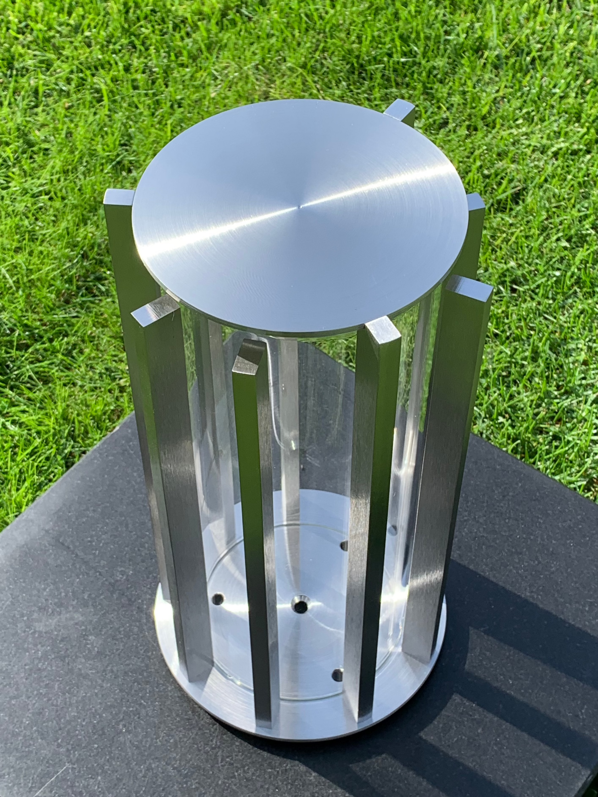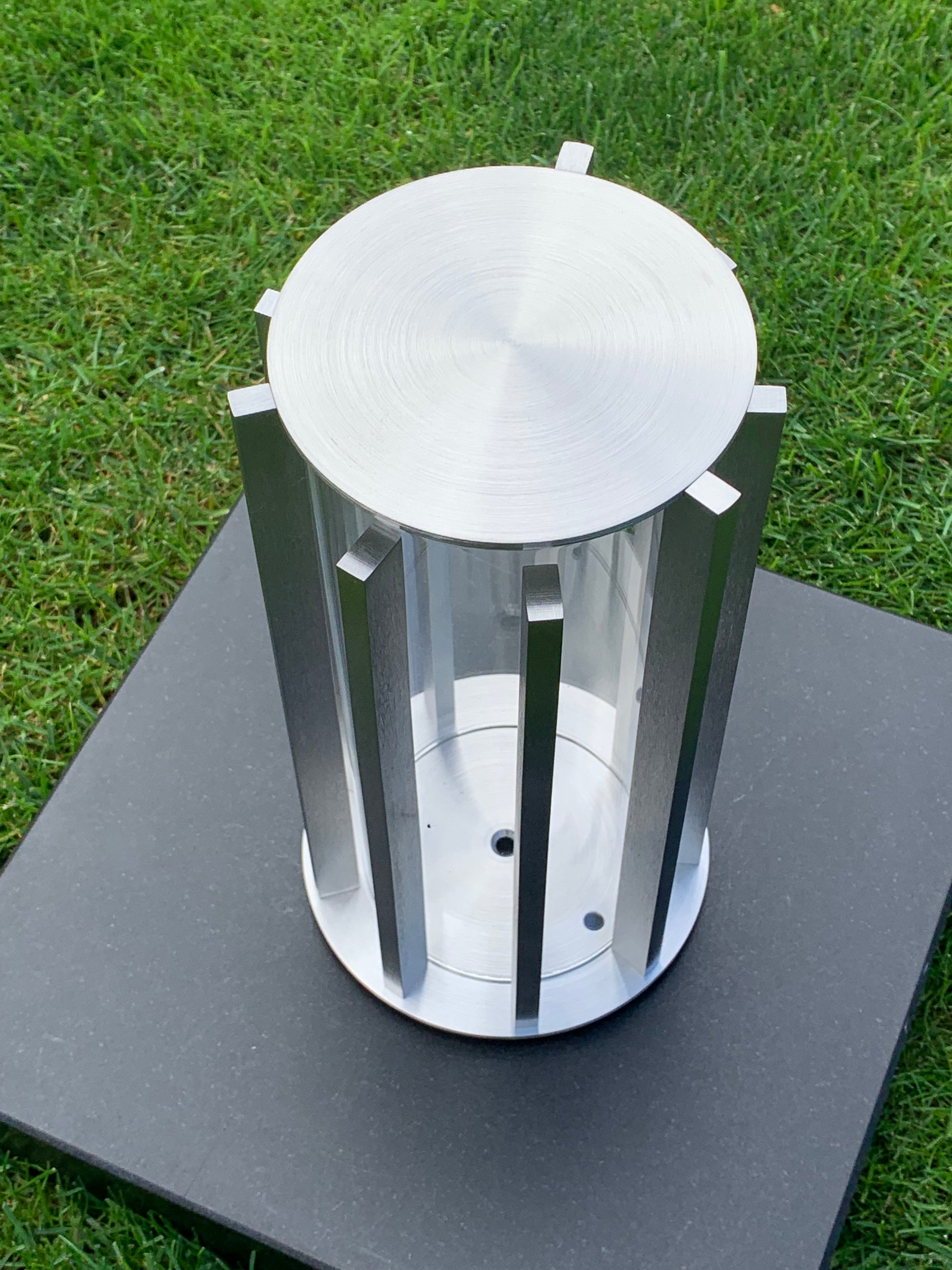 Zum Kerzen wechseln wird der Glaszylinder (Durchmesser 10cm Höhe 20-25cm) angehoben