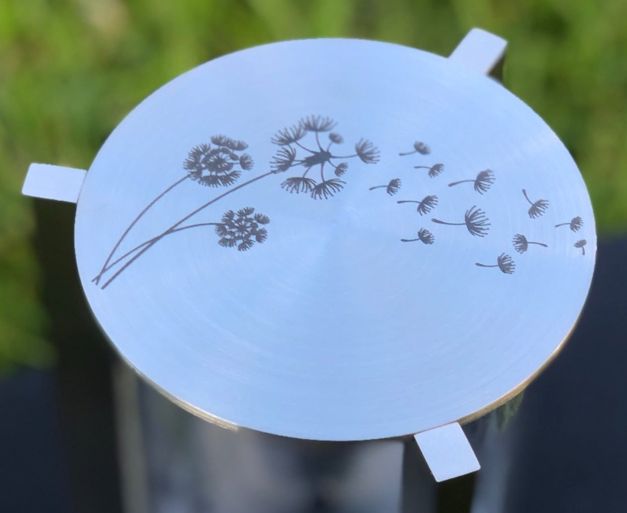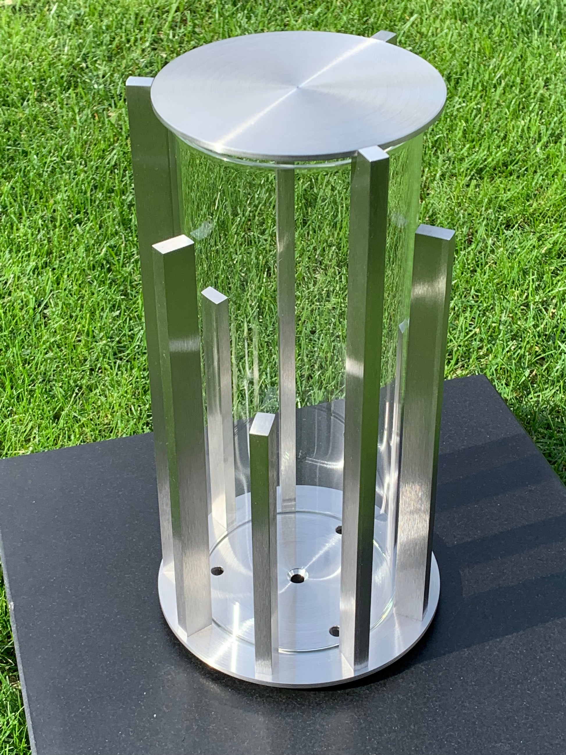 Zum Kerzen wechseln wird der Glaszylinder (Durchmesser 10cm Höhe 20-25cm) angehoben