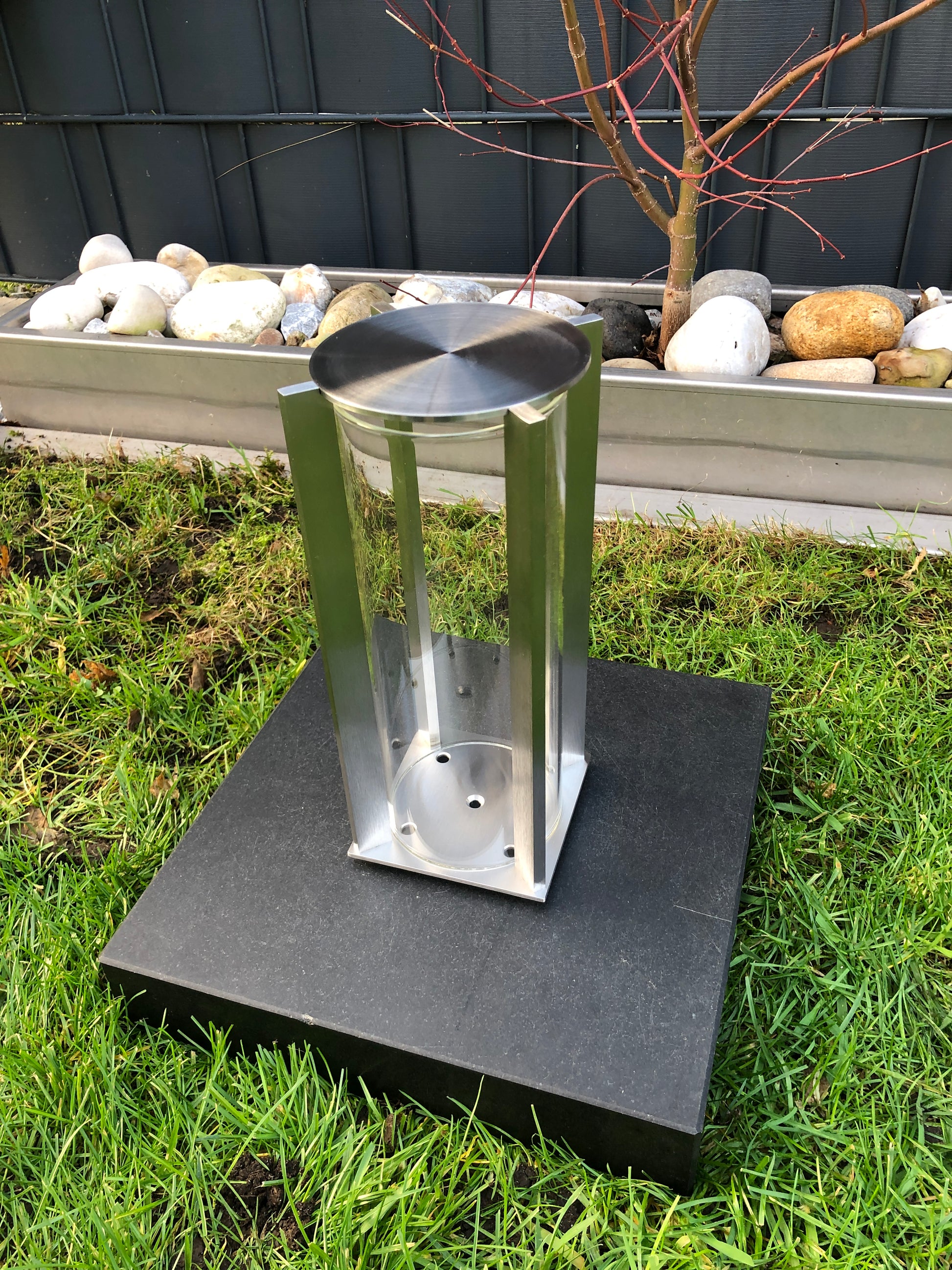 - auf Wunsch ist ein Erdspieß oder ein Anker zur Montage auf einem Sockel/Stein möglich