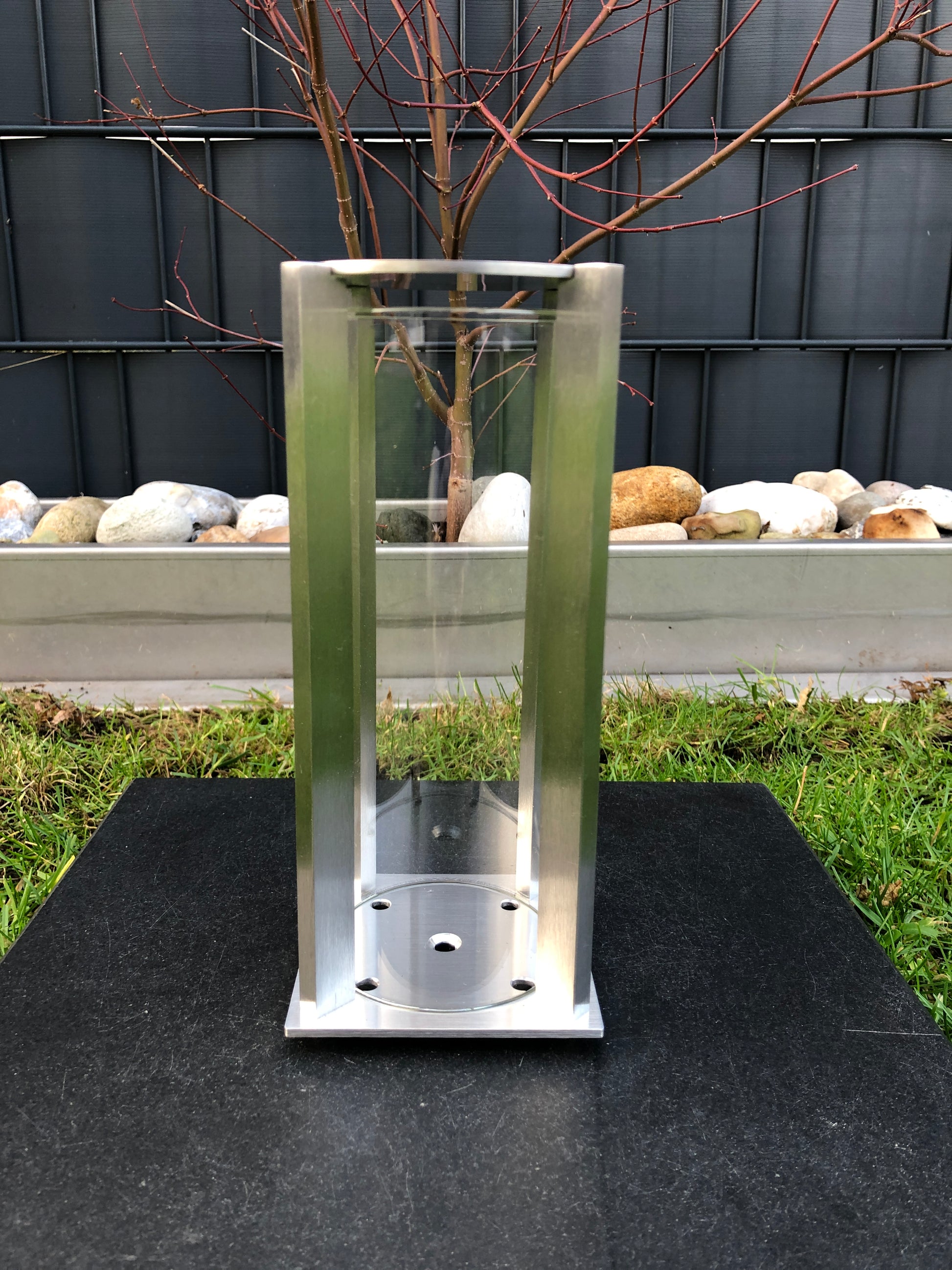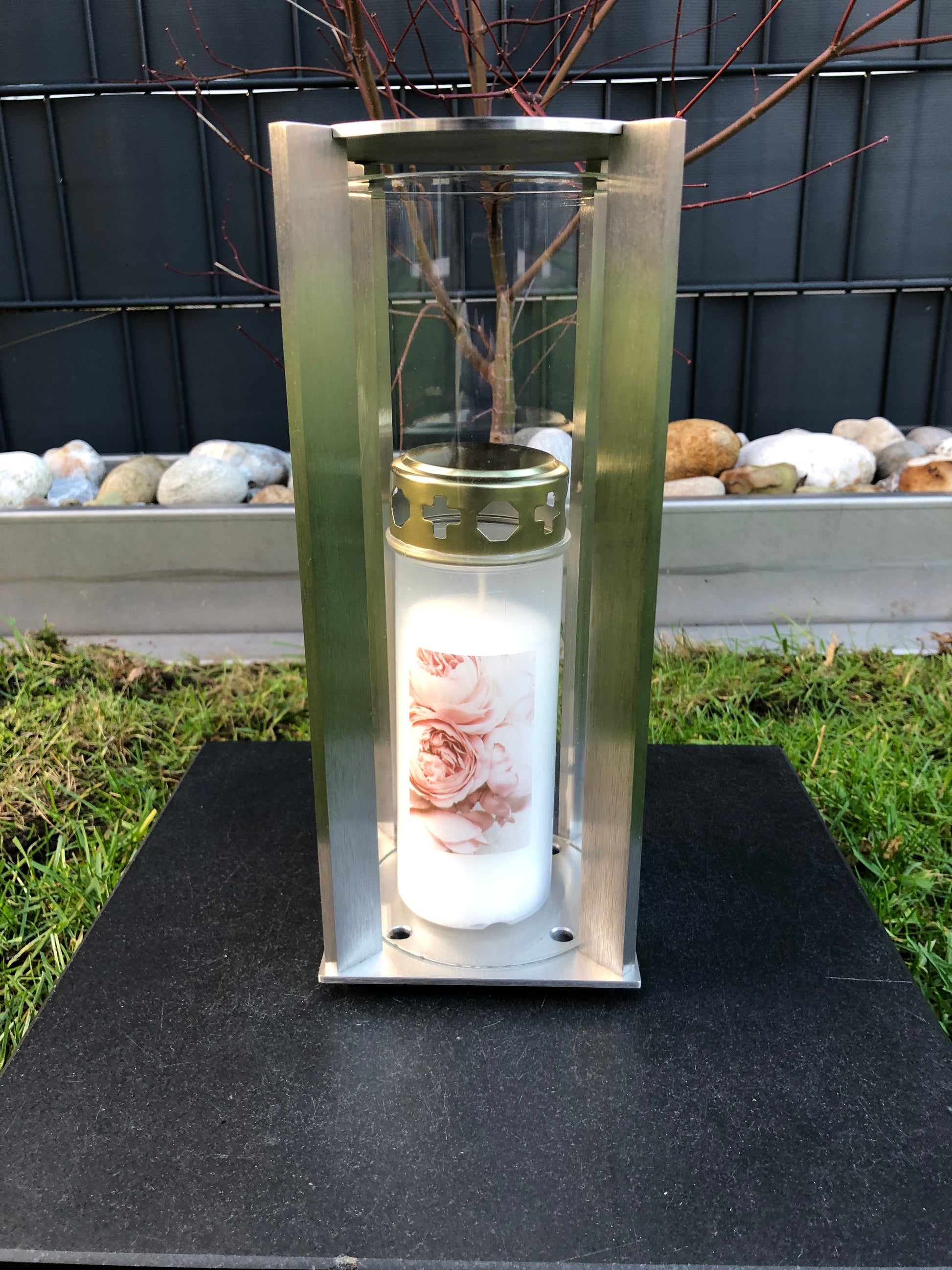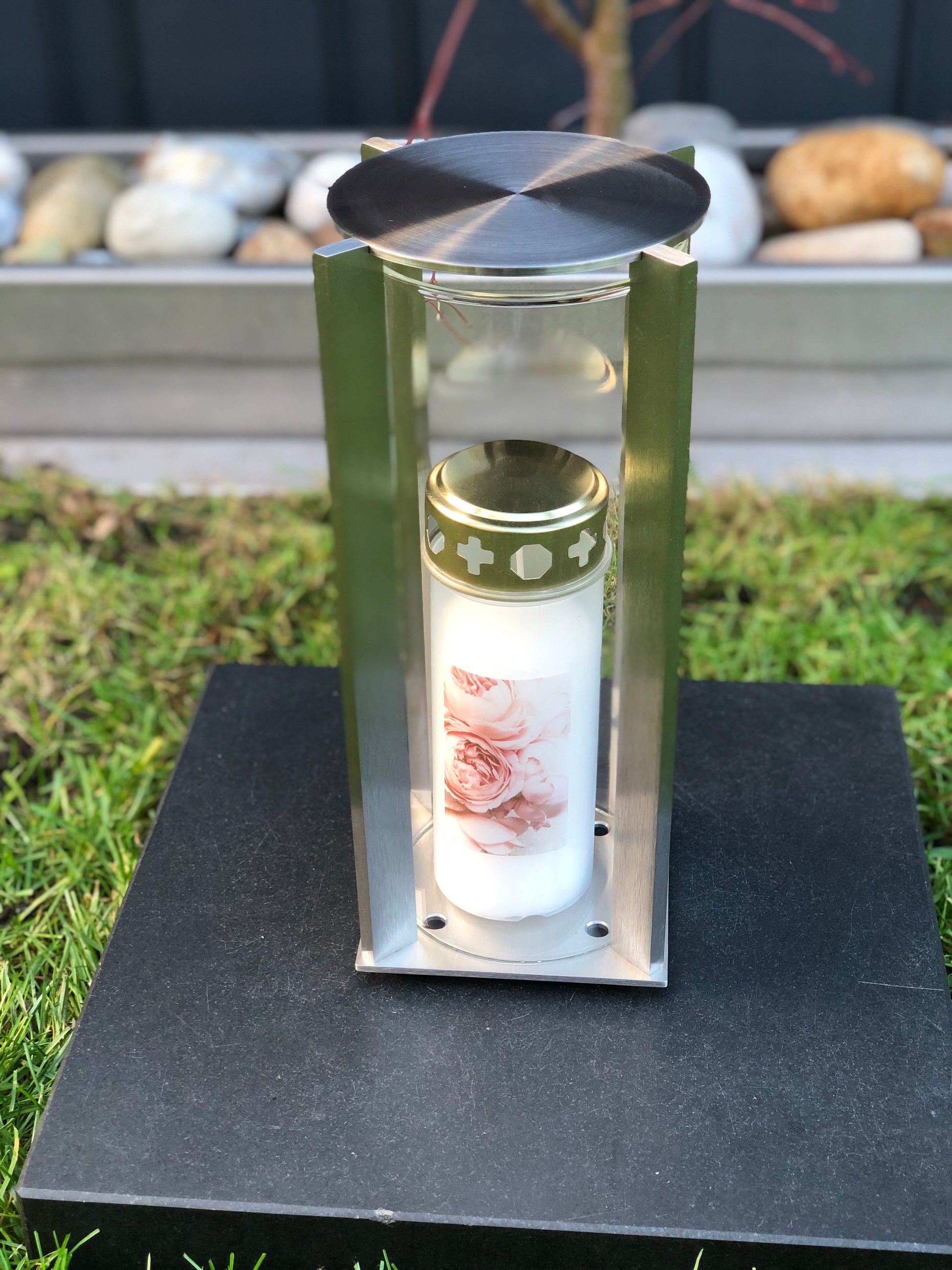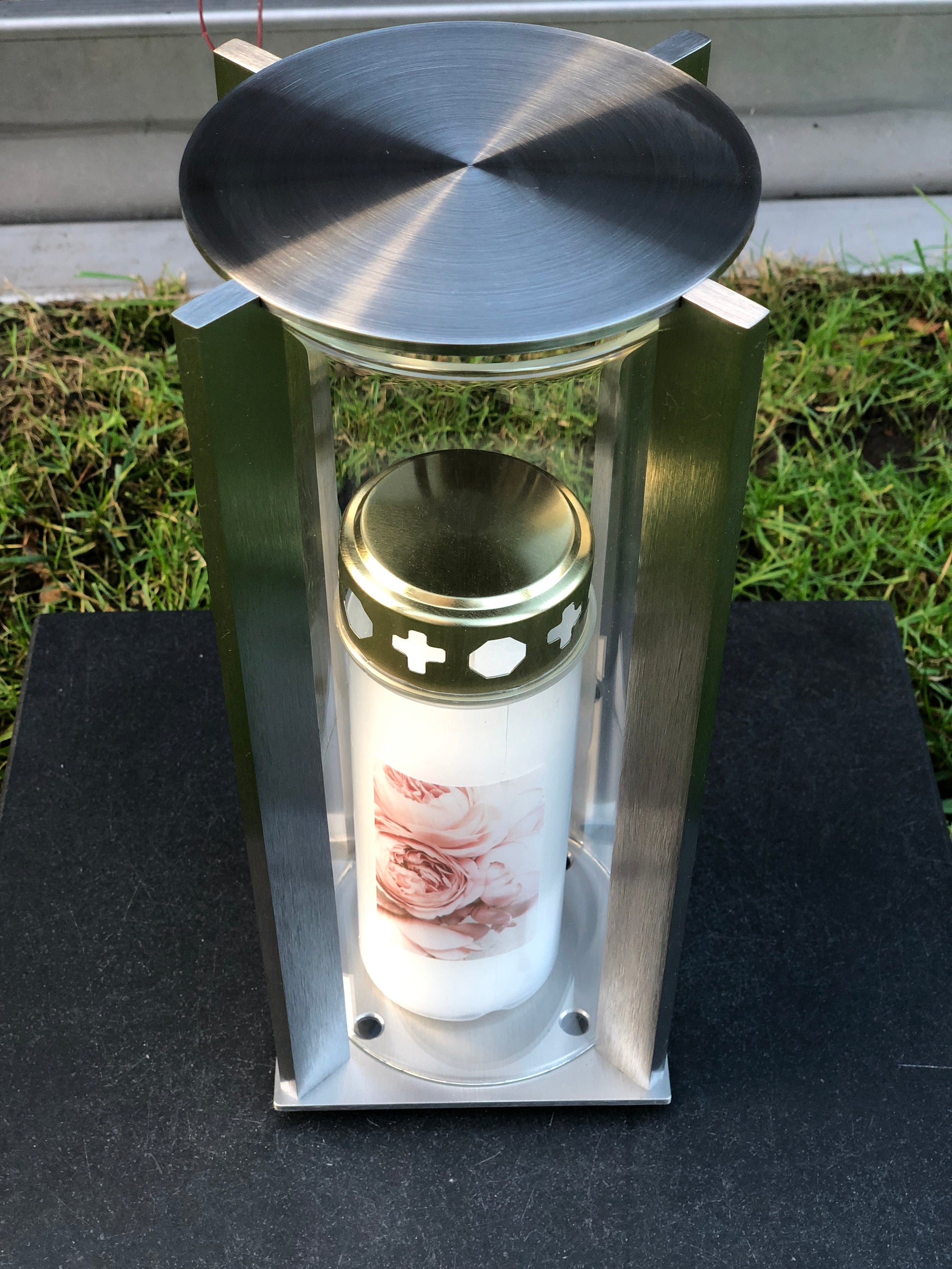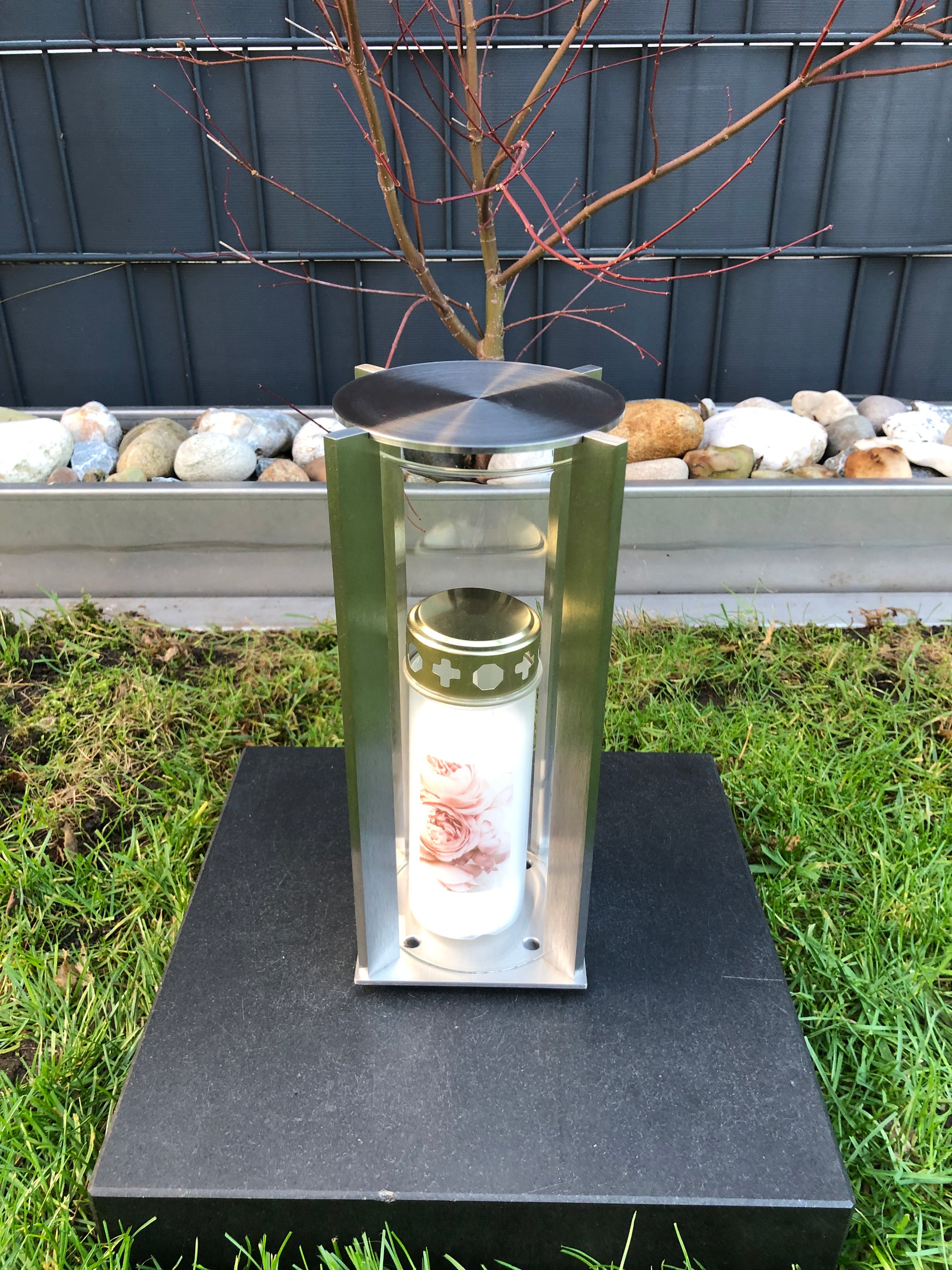 Die Laternen aus unserer Produktion sind für handelsübliche Grablichter ausgelegt, dieses Modell für einen 7-Tagesbrenner. Durch eine Belüftung brennt die Flamme zuverlässig und windsicher.