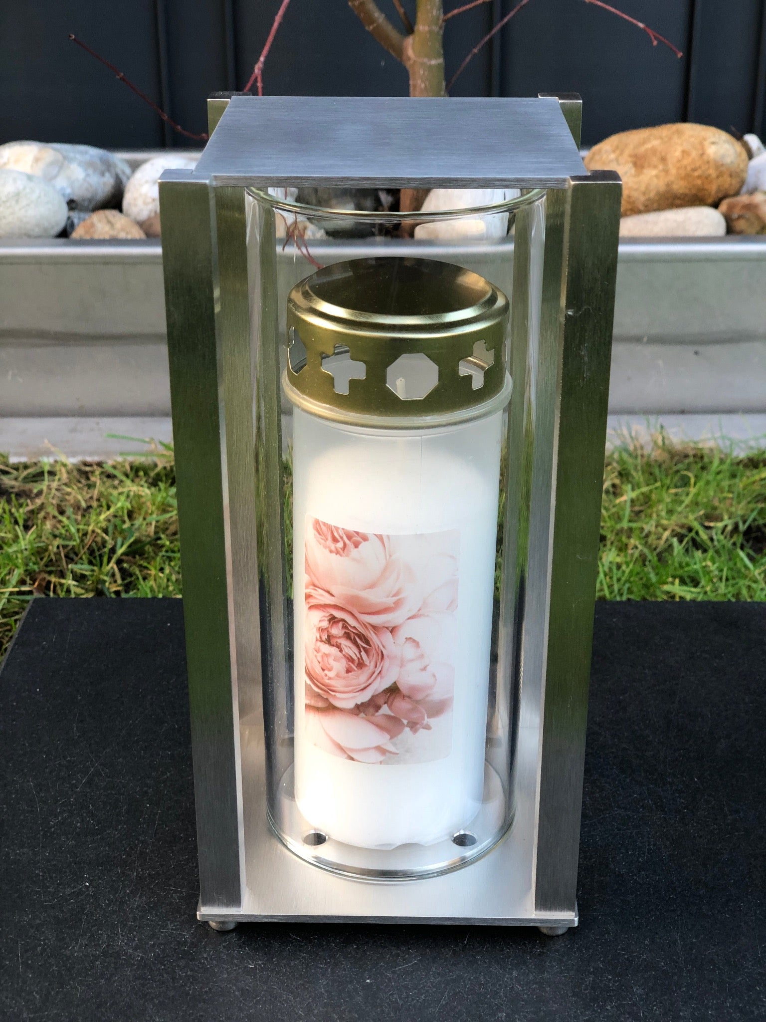 Die Laternen aus unserer Produktion sind für handelsübliche Grablichter ausgelegt, dieses Modell für einen 7-Tagesbrenner. Durch eine Belüftung brennt die Flamme zuverlässig und windsicher.